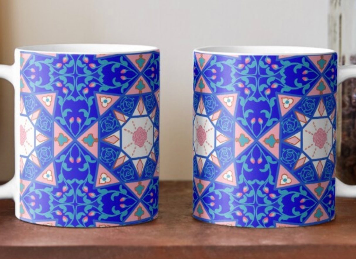 Below are some examples of my work created from the heart. The design on these mugs called Rose Season was inspired by beautiful pink roses with an Islamic and ethnic influence.